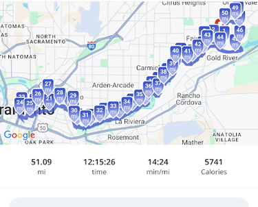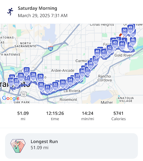 This is a screenshot from my longest run on March 29, 2025 - a 51 mile loop.