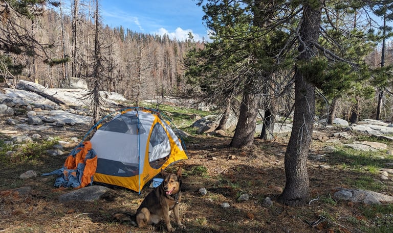 My trusty companion, Oliver the dog, stands guard at the tent, protecting it from squirrels and other ne'er-do-wells.